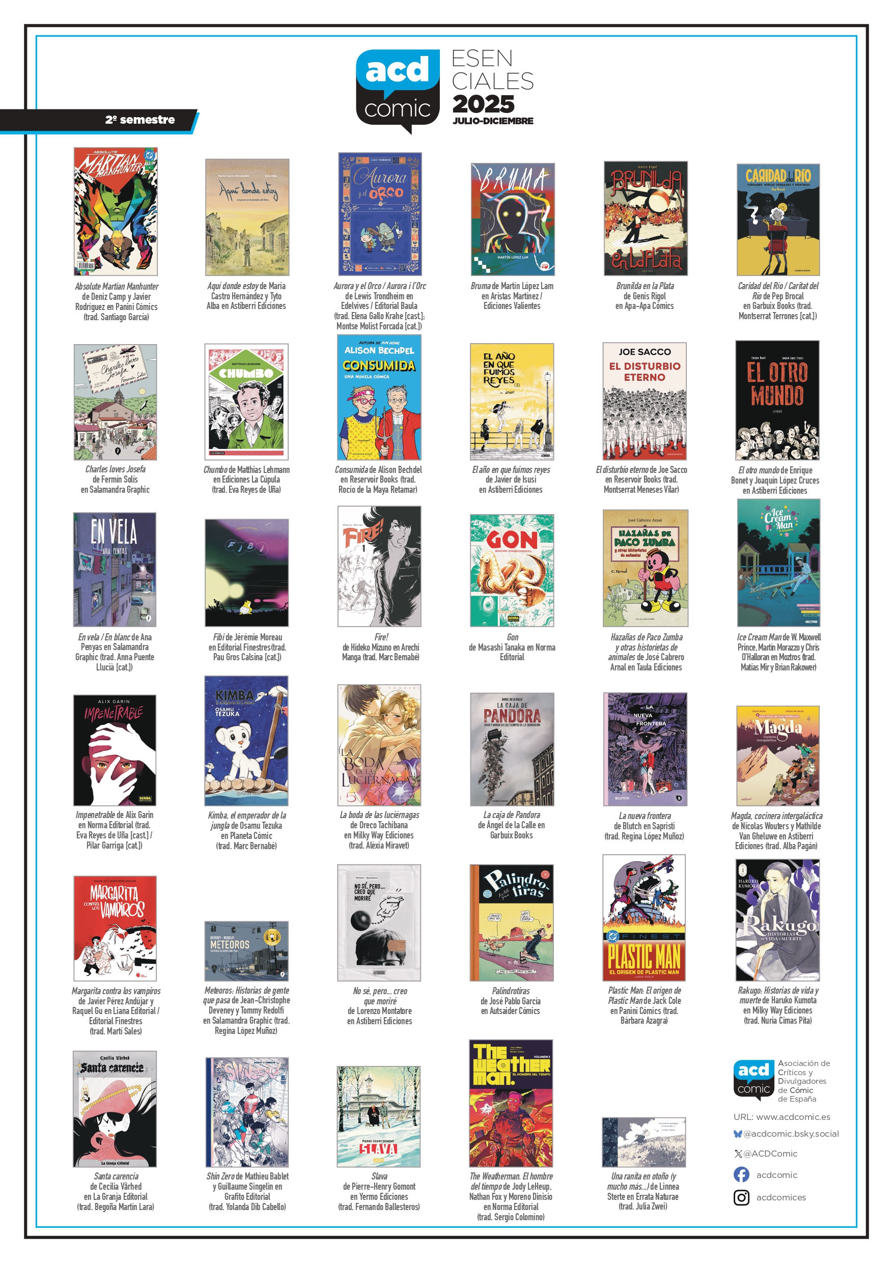 La Asociación de Críticos y Divulgadores de Cómic de España (ACDCómic) presenta el segundo listado de sus ‘Esenciales 2025’, una selección de cómics con la que esta organización pretende fijar la atención sobre algunas de las obras más destacadas de entre todas las editadas anualmente en nuestro mercado. El listado de este segundo semestre está formado por 35 obras, publicadas entre julio y diciembre de 2025, elegidas mediante votación interna entre los integrantes de la ACDCómic. Esta selección se presenta como una herramienta para animar a lectores, bibliotecas, librerías y otro tipo de colectivos culturales a descubrir estas obras destacadas.